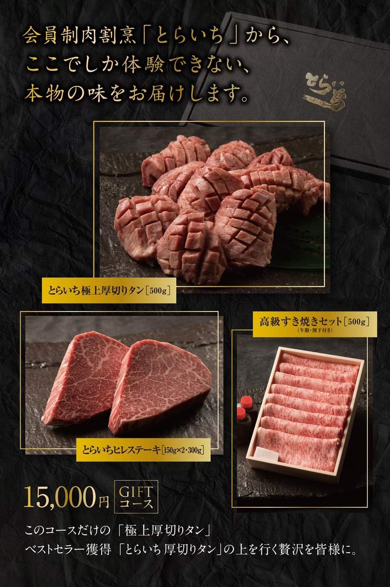 | 内容 | ・とらいち厚切り牛タン(300g) ・極上ホルモン(500g) ・和牛霜降り焼肉セット(250g) | ・とらいち厚切り牛タン(600g) ・和牛霜降り焼肉セット(500g) ・高級すき焼きセット(300g) | ・とらいち極上厚切り牛タン(500g) ・高級すき焼きセット(500g) ・とらいちヒレステーキ(150g×2) |