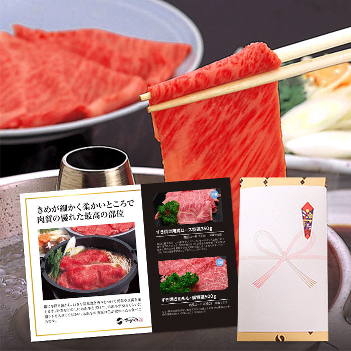 松阪牛、神戸牛、米沢牛、A5黒毛和牛のカタログの中から、お好きなお肉を4商品お選びいただけます。